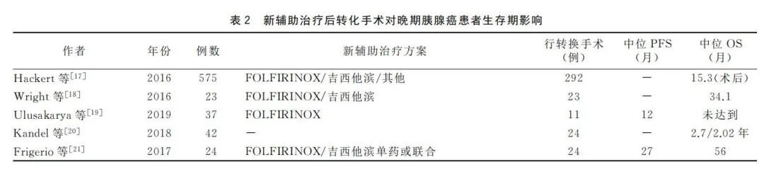 在2010年,一项系统性综述和荟萃分析报告了新辅助化疗后的反应率和切除率。该系统性综述共纳入111个研究,共4394例,其中46%被归类为不可切除的患者。这些人中的大部分接受氟尿嘧啶或吉西他滨为基础的化疗(FOLFTRINOX方案当时尚未被引进)。结果显示4.8%的患者完全缓解,30.2%的患者部分缓解。在边缘可切除胰腺癌和LAPC,有33%的切除率。试验组患者的中位生存期对比可切除患者的中位生存期分别为20个月和23个月,提示不可切除患者在接受新辅助化疗治疗后总生存获益与可切除患者无明显差别。2016年海德堡团队发表了一项研究,该项研究纳入了575例接受新辅助化疗的患者,其中有292例接受了手术治疗,中位总生存时间长达术后15.3个月,见表2。