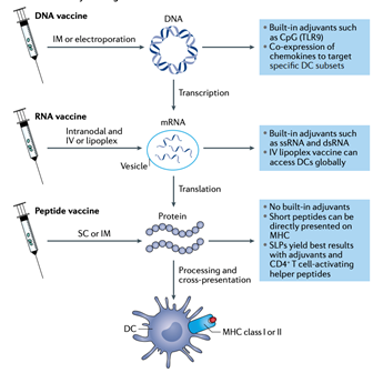 从下图可以看出,万变不离其宗,这三种类型归根结底就是让癌细胞抗原能顺利扎营在树突状细胞上。如果是树突状细胞作为传递方式,相当于大部分安装工程都得在体外完成,如果选择RNA/DNA就比较取巧(偷懒),体外简简单单合成以后,丢到人体内,让人体细胞自己完成剩下的工作,但却有抗原不能顺利被树突状细胞接纳的风险。