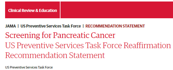 [1] US Preventive Services Task Force, Screening for Pancreatic Cancer US Preventive Services Task Force Reaffirmation Recommendation Statement. JAMA. 2019;322(5):438-444. doi:10.1001/jama.2019.10232