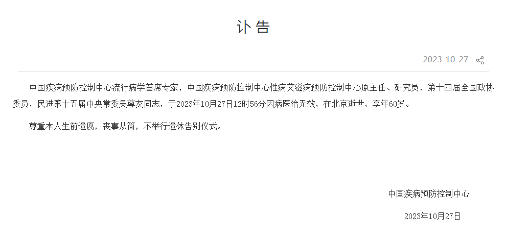 中国疾控中心流行病学首席专家、性病艾滋病预防控制中心原主任、研究员吴尊友,因病医治无效,于10月27日12时56分在京逝世,享年60岁。