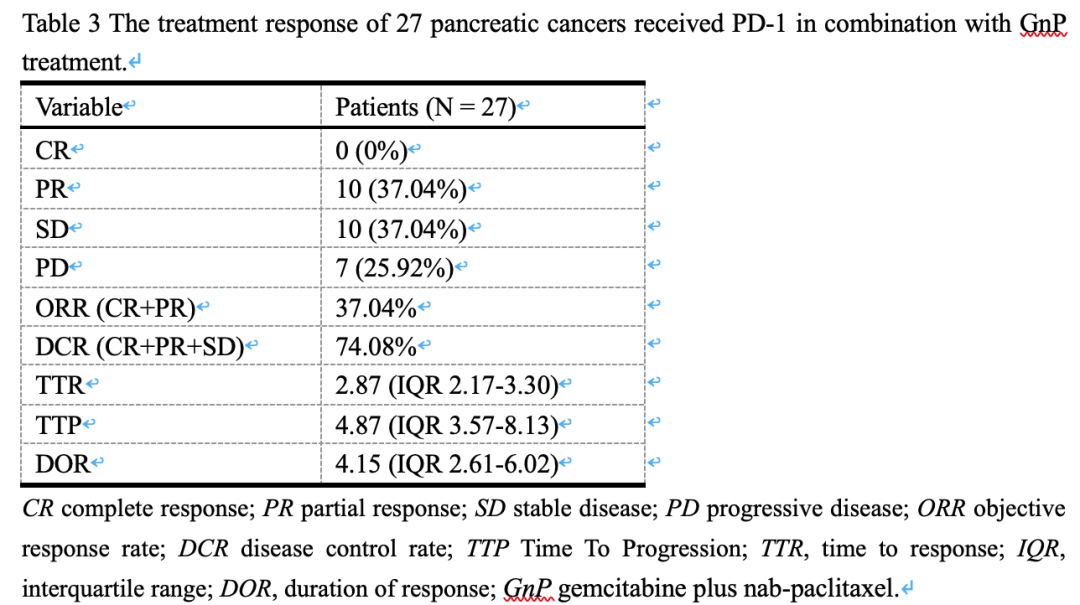 在这项回顾性研究中,从2019年2月20日至2021年6月21日,来自我们医院的27名无法手术切除的局部晚期或转移性胰腺癌患者接受了PD-1和GnP的治疗。