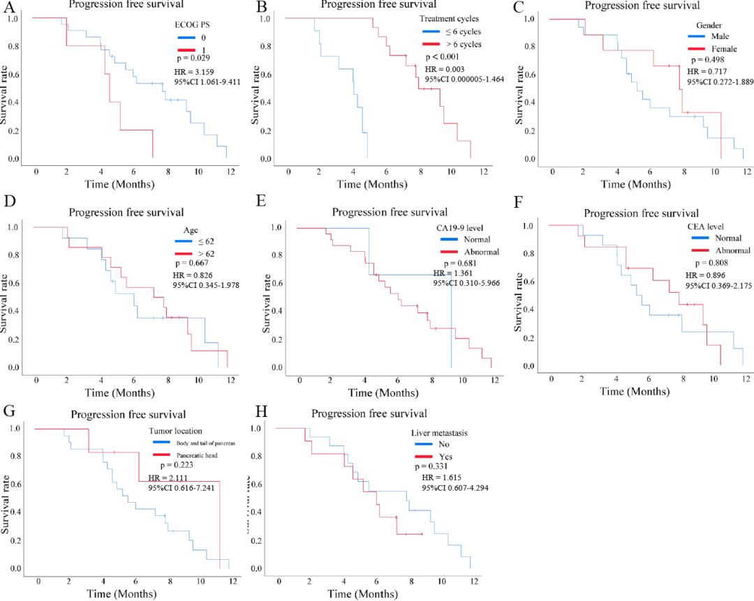 结果四:就无疾病进展生存期(PFS)而言,ECOG PS(0 vs. 1,p = 0.029,HR = 3.159,95%CI 1.061-9.411,图A)和治疗周期(<= 6周期 vs. >6周期,p < 0.001,HR = 0.003,95%CI 0.000005-1.464,图B)与胰腺癌的PFS相关。