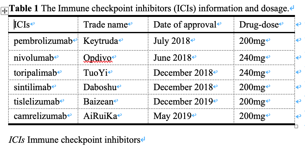 在我们的研究中,所有患者按照21天一个周期接受PD-1与AG治疗。PD-1每3周一次。所有PD-1的信息和剂量都总结在表1中。AG方案如下表2.