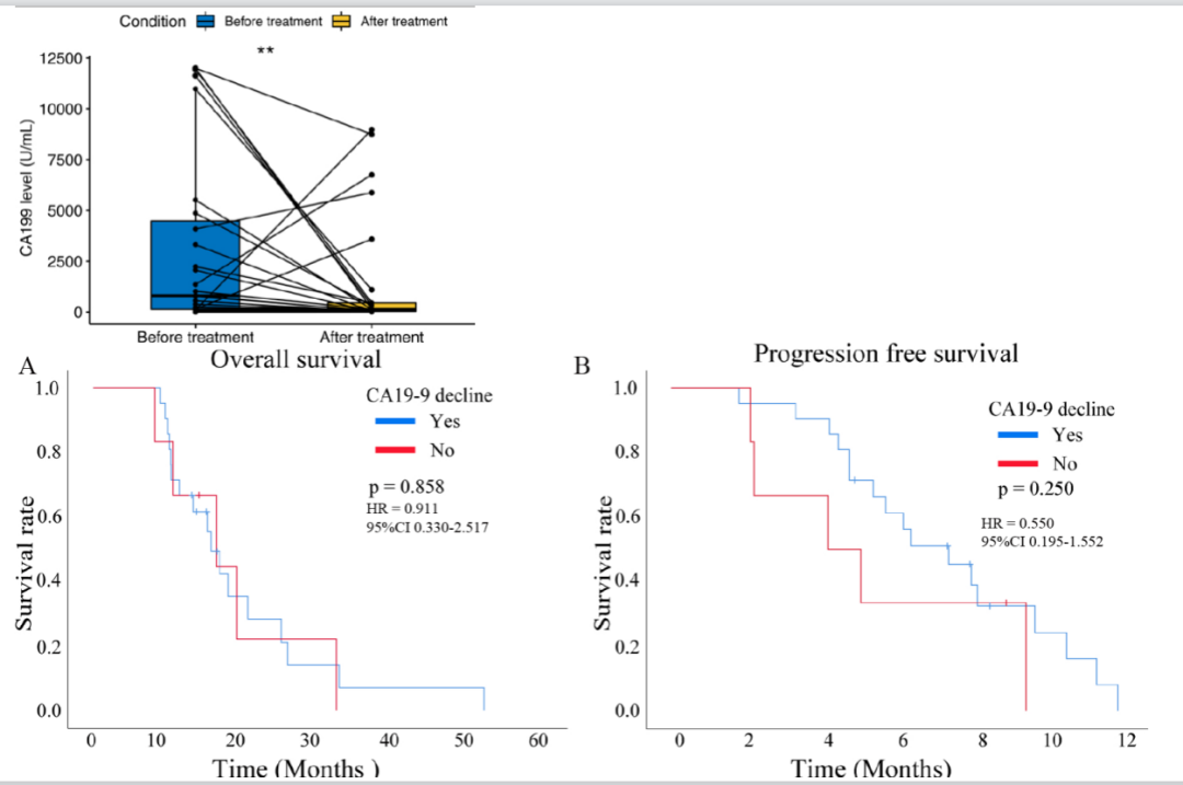 结果五:肿瘤标志物CA19-9在接受PD-1与AG治疗的胰腺癌患者中显示出明显的降低趋势(p < 0.01)。然而,降低的CA19-9水平对总生存期(OS)没有产生影响(p = 0.858,HR = 0.911,95%CI 0.330-2.517,图A)和无疾病进展生存期(PFS)(p = 0.250,HR = 0.550,95%CI 0.195-1.552,图B)。
