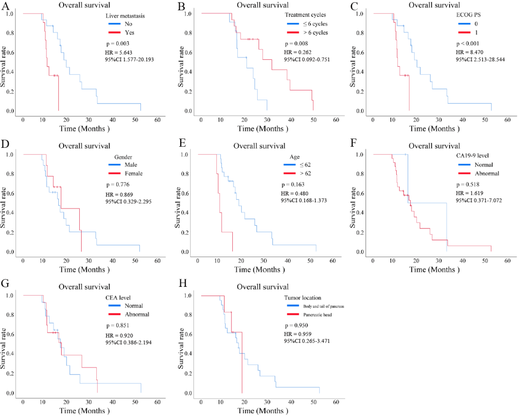 结果三:关于患者不同特征与总生存期(OS)之间的关系,我们发现肝转移(是 vs. 否,p < 0.001,风险比(HR)= 5.643,95%置信区间 1.577-20.193,图A),治疗周期(<= 6周期 vs. >6周期,p = 0.008,HR = 0.262,95%CI 0.092-0.751,图B)和 ECOG PS(0 vs. 1,p = 0.003,HR = 8.470,95%CI 2.513-28.544,图C)与胰腺癌的总生存期显著相关。