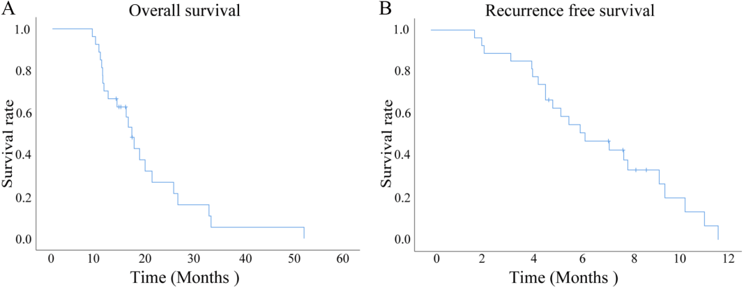 结果二:治疗中位周期为7 个周期(范围3-14周期)。在这些胰腺癌患者中,中位总生存期(OS)为16.4个月 [标准误差(SE)= 1.117,95%置信区间(CI) 14.211-18.589](图A),而中位无疾病进展生存期(PFS)为6.4个月(SE = 1.217,95% CI 3.981-8.752)(图B)。1年生存率为66.7%,2年生存率为18.5%,而6个月的无疾病进展生存率为51.9%,12个月的无疾病进展生存率为0。