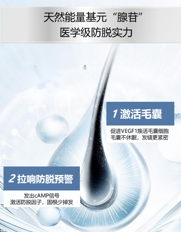 主打的就是有效防脱成分—腺苷,它是一种我们身体里自有的成分,经常以ATP(三磷酸腺苷)的形式参与能量的传递,起到促进细胞代谢的作用。