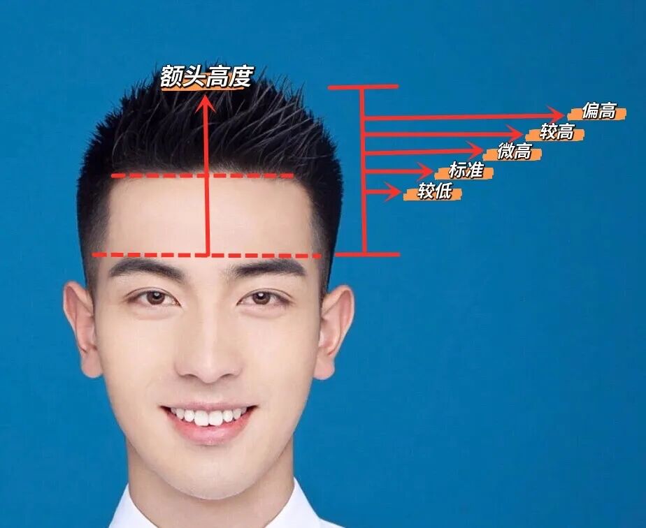 额高就是额头的高度,有很多男士都会出现额头偏高的现象,额高细分的话又分较低、标准、微高(轻微高)、较高(中度高)、偏高(重度高),而额头偏高基本都是需要刘海进行修饰额头。