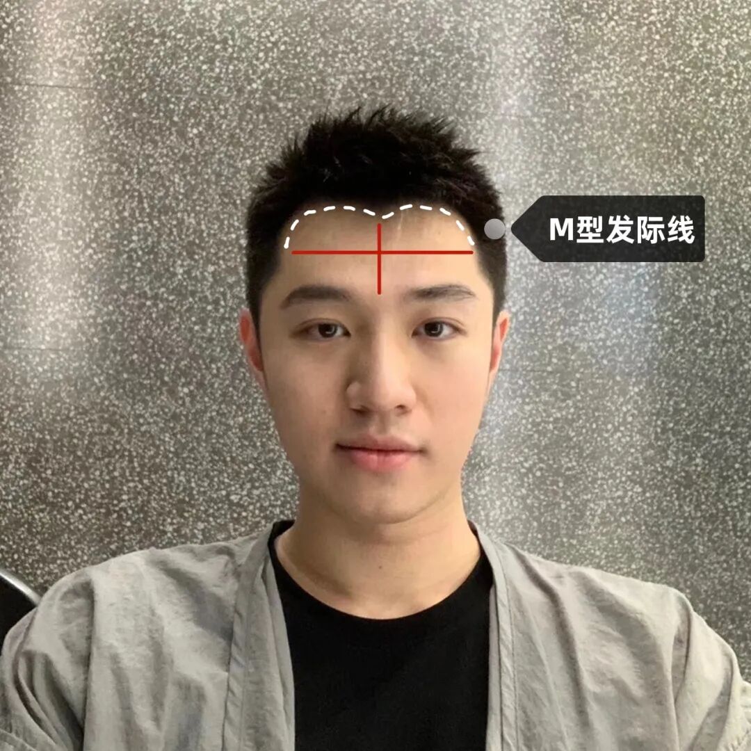 M型发际线代表的就是前额发际线呈现一个M形状,这个是很多男生在选择发型时最头疼的问题,这个细分的话,又分轻度M、中度M、重度M,每一种不同程度在选择发型的类型以及刘海的形态上也会不一样。