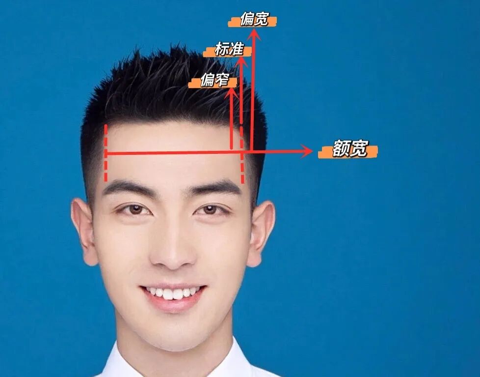 额宽就是额头的宽度比例,额宽又分偏窄、标准、偏宽,额头偏窄的可以考虑把发际线修宽一点,这样显得额头更加饱满,额头偏宽的男生就需要用刘海遮盖一点额头,这样看起来才会更加协调一些。