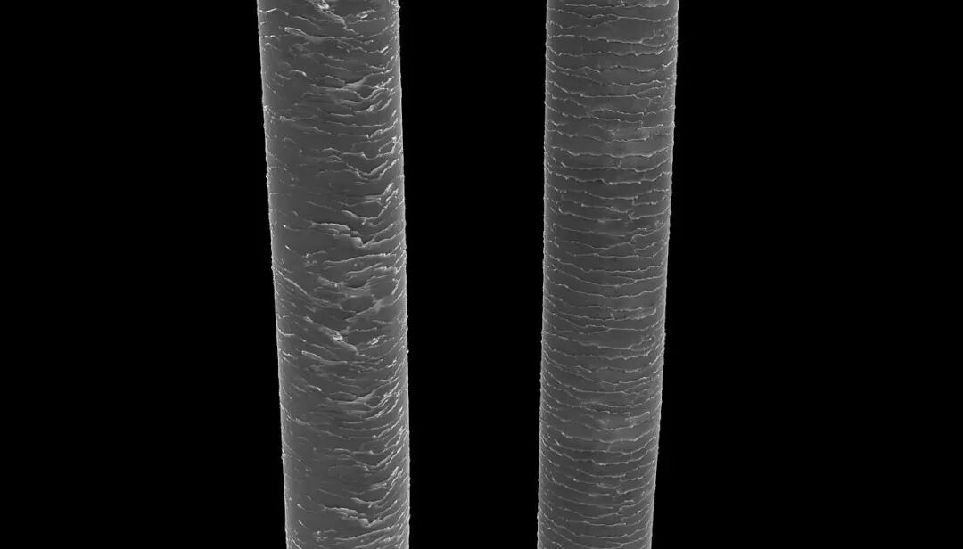 发质的粗细就是指每一根头发的粗细程度,细分的话分为细软发质、适中、粗硬发质这三个种类,发型细软的特征就是很容易导致头顶造型比较服帖,发质粗硬的特征就是很容易导致整体发型翘起来,关于发质的粗细可以看下图显微镜的放大效果。