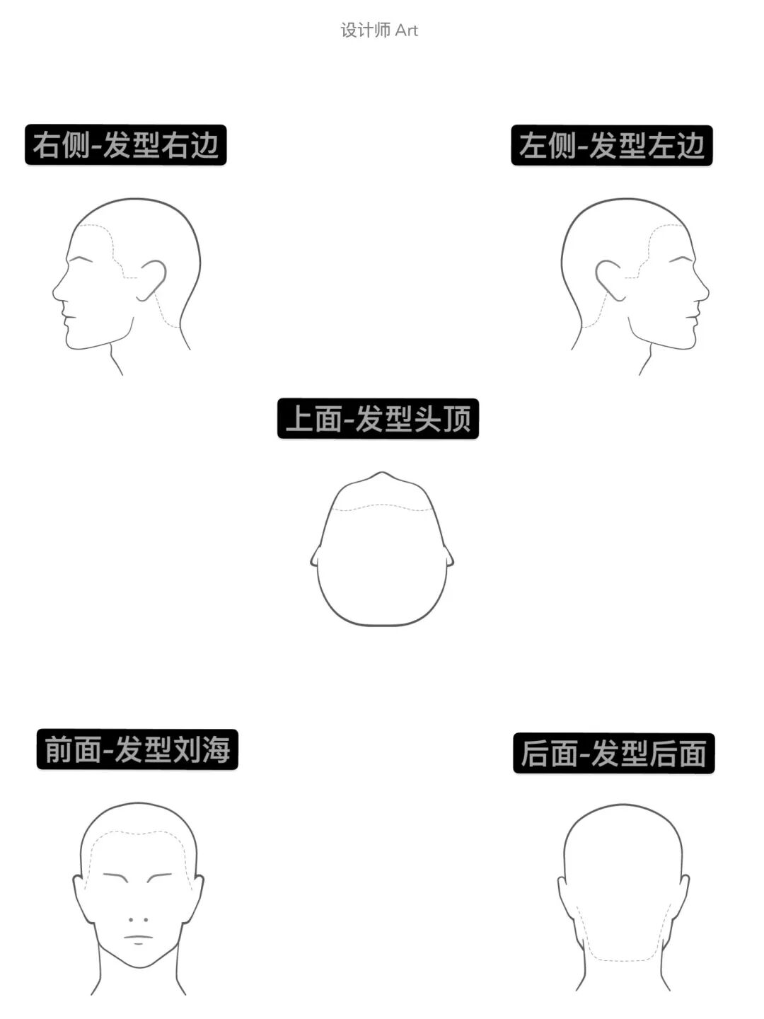 在设计发型时,除了考虑脸型的部分,头型也是非常重要的一个版块,头型需要考虑的就是头部的五个面,也就是前面(前额)、头顶,两侧,后头部,由这五个面结合发型的修饰达到一个整体协调的视觉。