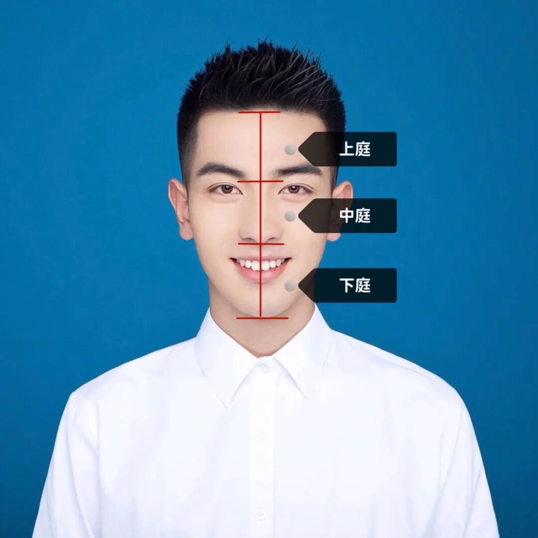 三庭分为上庭、中庭、下庭,通俗讲就是代表脸型的长度,一般三庭偏长的男生就需要考虑发型来修饰脸型了;三庭如果细分的话,每一庭都需要做分析,比如有些男生上庭偏长一般就是额头偏高了,下庭偏长就是下巴偏长了,这些情况都需要发型来做协调修饰。