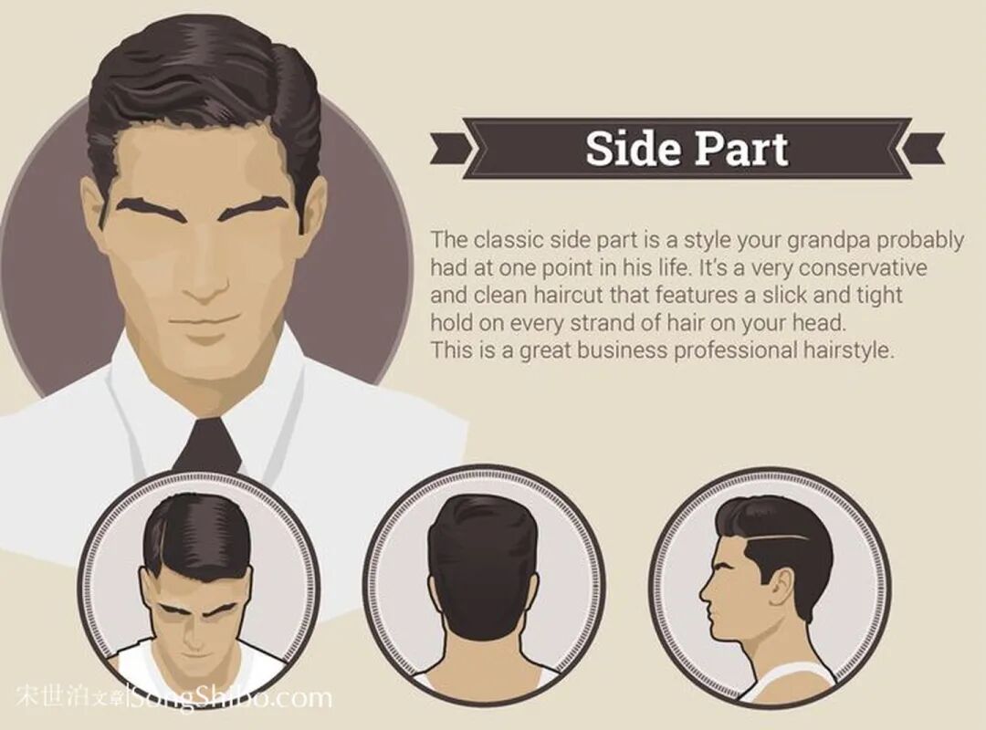 一般会梳三七分,发际分线要干净利落。梳Side Part的时候,需要借助发蜡等美发用品将头发梳得整齐油光。这种最适用于礼服场合,也可叫礼服头。