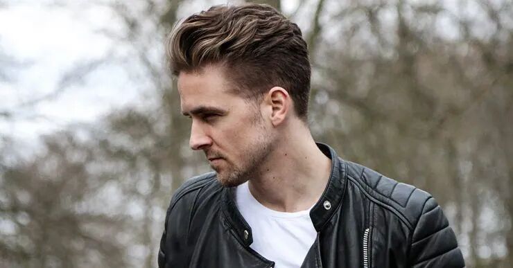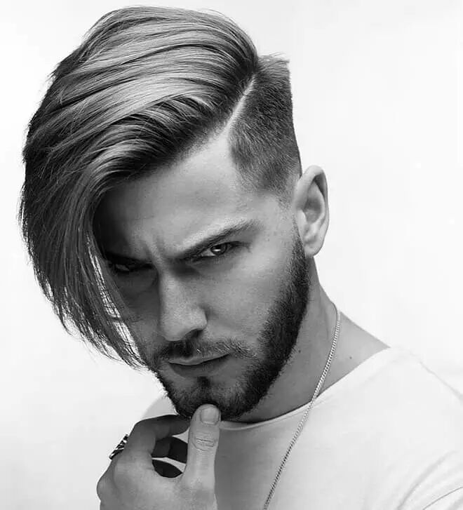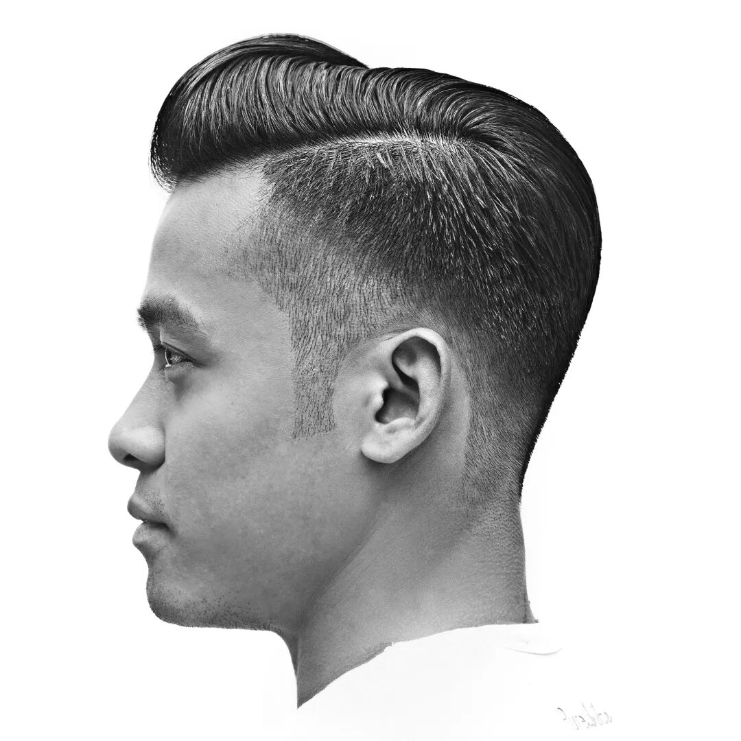 将头发刻意全部向后梳的油头,会将两侧剃短一起向后梳,分线利落明显。
