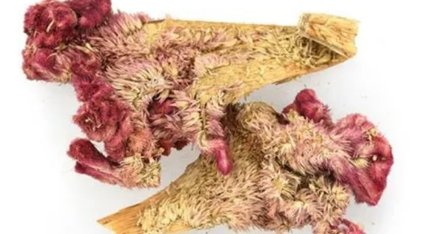 4.酒制取鸡冠花小块与黄酒拌匀,稍润,置锅内用文火炒至微干,取出,晾干。每鸡冠花500g,用黄酒60g(《河南》)。