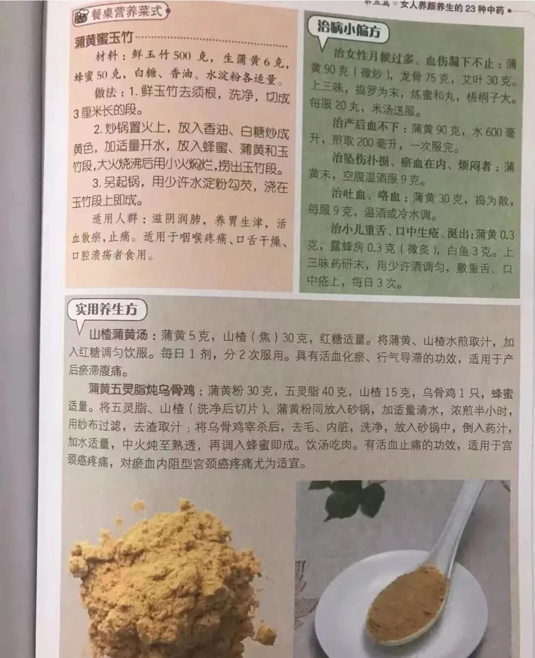 蒲黄味辛,能活血通经、消瘀止痛,凡跌打损伤、痛经、经闭、心腹疼痛等瘀血作痛者均可应用,尤为妇科所常用。
