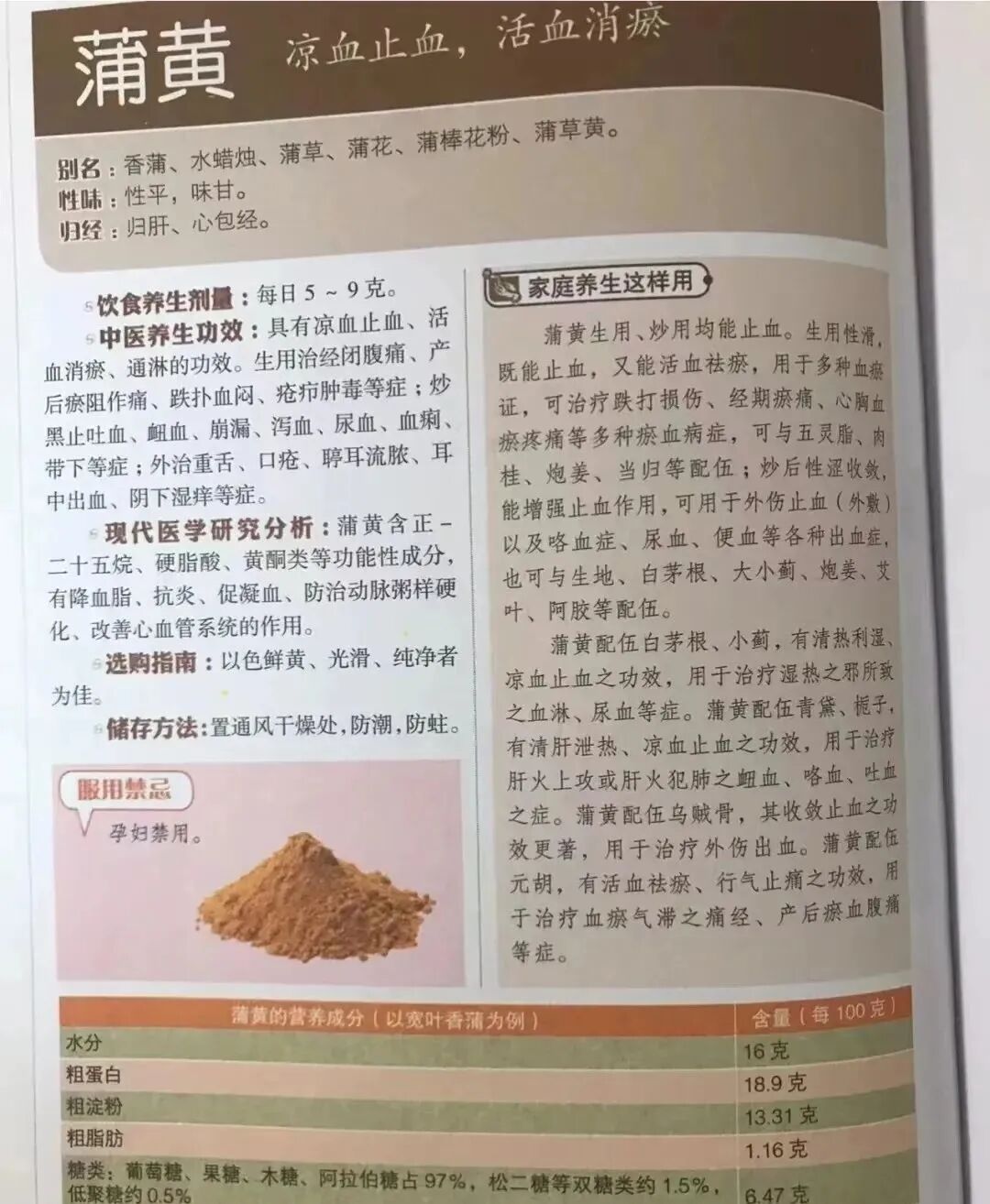 中医认为,蒲黄味甘、微辛;性平。归肝;心;脾经。止血;祛瘀;利尿。主吐血;咯血;衄血;备痢;便血;崩漏;外伤出血;心腹疼痛;经闭腹痛;产后瘀痛;痛经;跌扑肿痛;血淋涩痛;带下;重舌;口疮;聤耳;阴下湿痒。【用法用量】内服:煎汤,5-10g,须包煎;或入丸散。外用:适量,研末撒或调敷。散瘀止痛多生用,止血每炒用,血瘀出血;生熟各半。【注意】.孕妇慎服。