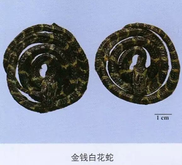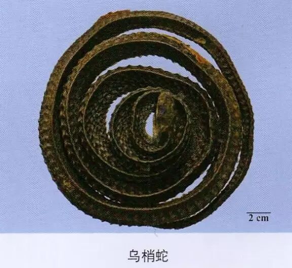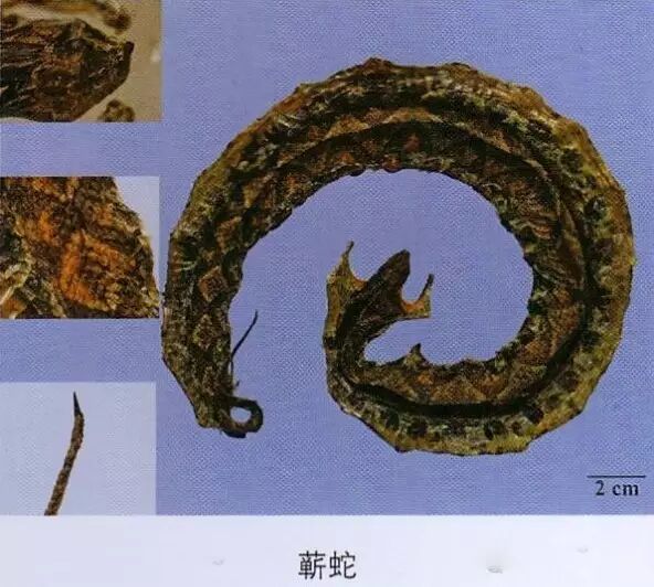 蕲蛇:其头,习称翘鼻头;其背部V形的两上端在背中线上相接,习称方胜纹;腹部,习称连珠斑;尾部,习称佛指甲。