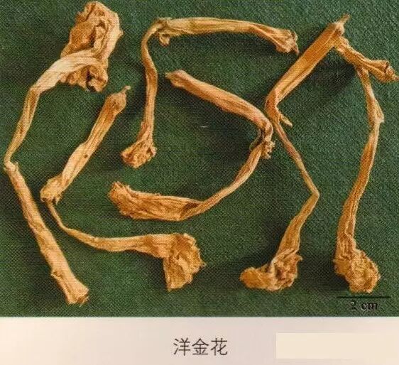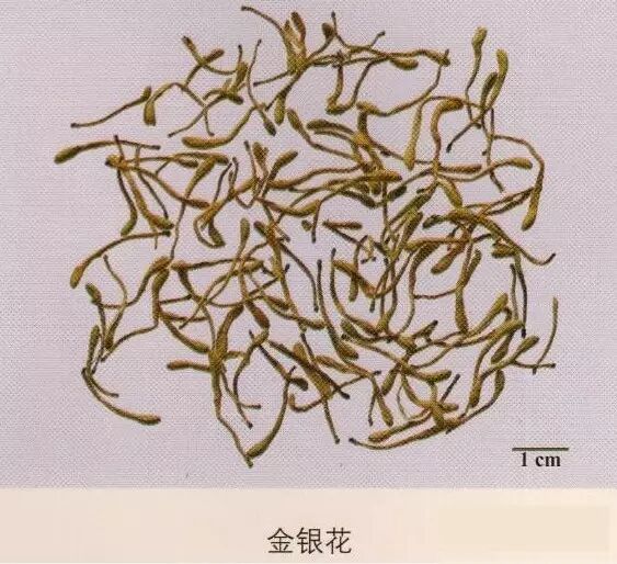 金银花:呈棒状,上粗下细,略弯曲