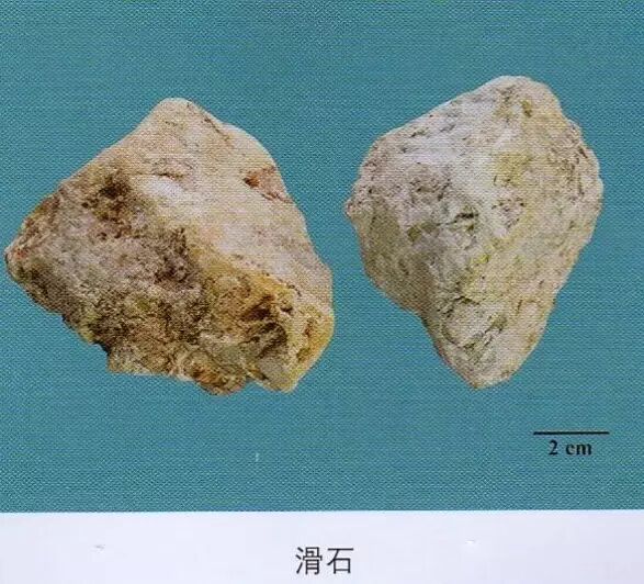 滑石:有蜡样光泽,条痕白色。