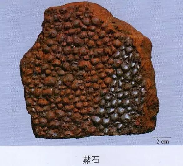 赭石:一面多有圆形的突起,习称钉头;另一面与突起相对应处有相同大小的凹窝。