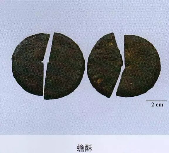 蟾酥:气微腥,味初甜而后有持久的麻辣感,粉末嗅之作嚏。断面沾水,即呈乳白色隆起。
