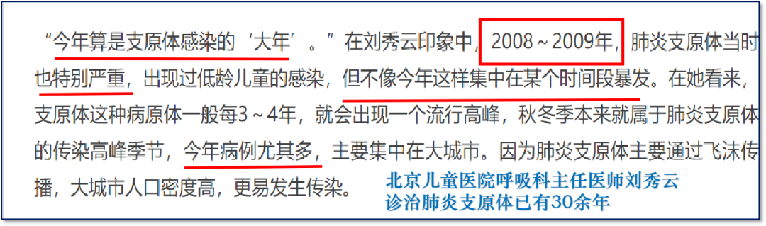 据专家们说,过去每隔3-5年会流行一次支原体肺炎,2008—2009年支原体肺炎也曾大爆发一次,但是过去从没有象今年这样集中在某个时间段爆发,过去的肺炎疫情从没有象今年这么凶猛。