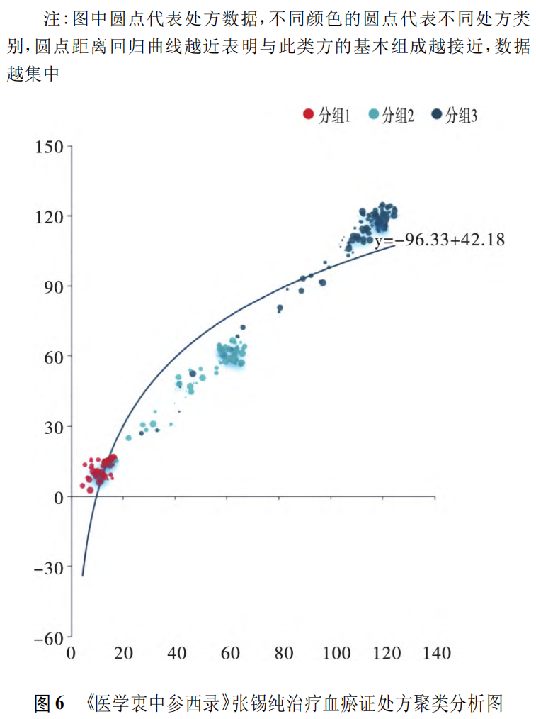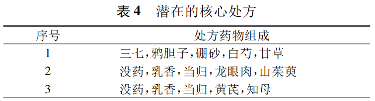 对聚类结果进行数据提取可得到没药,乳香,当归,黄芪,知母没药,乳香,当归,龙眼肉,山茱萸三七,鸦胆子,硼砂,白芍,甘草3首潜在的核心处方。