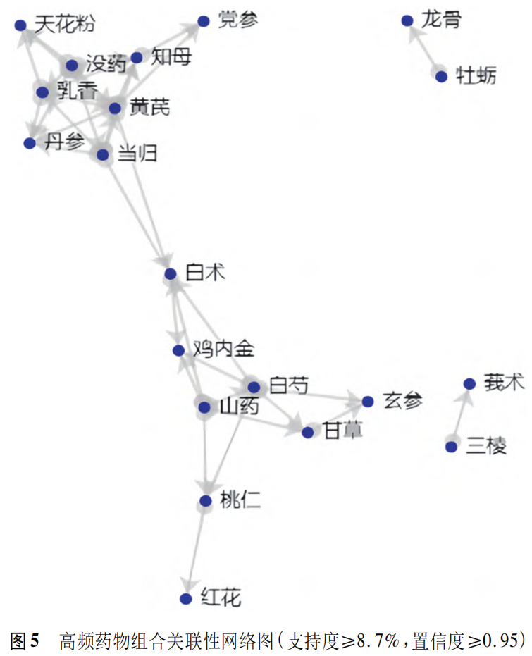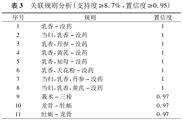 分析高频组合、网络图及关联规则可得到没药-乳香三棱-莪术牡蛎-龙骨3种高频次、高置信度且各自独立的药物组合。