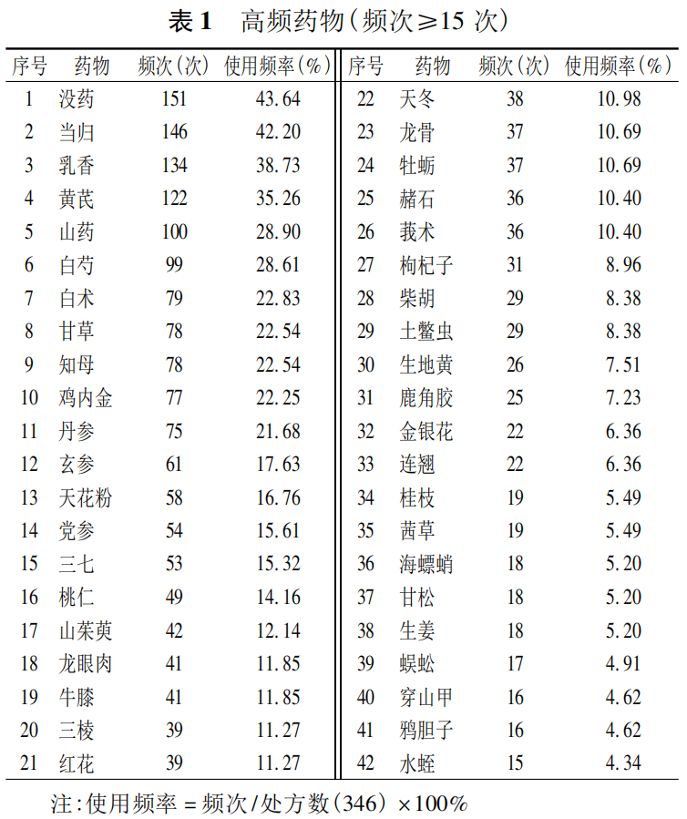 346首处方中共出现中药179味,总用药频次2655次,频次≥15次的药有42味,频次前4味为没药、当归、乳香、黄芪。结果见表1。
