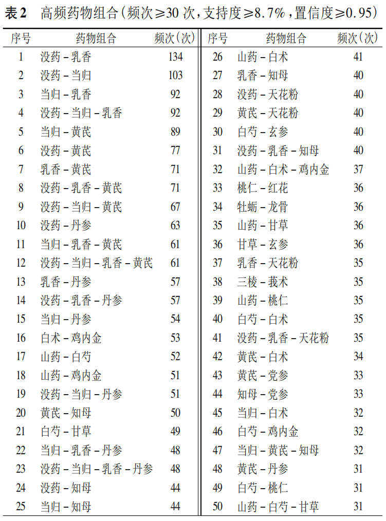 获得频次≥30次的高频药物组合50组,2味药药物组合36组,3味药药物组合12组,4味药药物组合2组,高频组合包括没药-乳香(134次)、没药-当归(103次)、当归-乳香(92次)、没药-当归-乳香(92次)、当归-黄芪(89次)等,结果见表2。