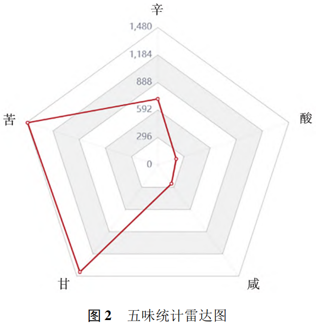 五味中辛711次、苦1471次、甘1424次、咸250次、酸208次,以苦、甘、辛味为主;