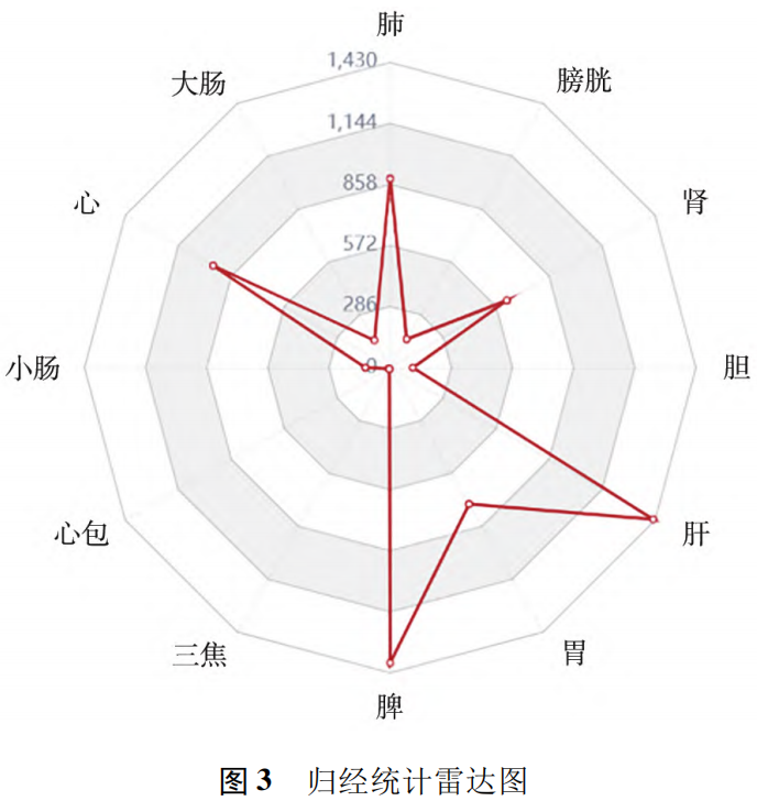归经中归肺经885次、大肠经148次、心经956次、小肠经116次、心包经9次、三焦经7次、脾经1383次、胃经738次、肝经1421次、胆经106次、肾经630次、膀胱经154次,以肝、脾、心经为主;