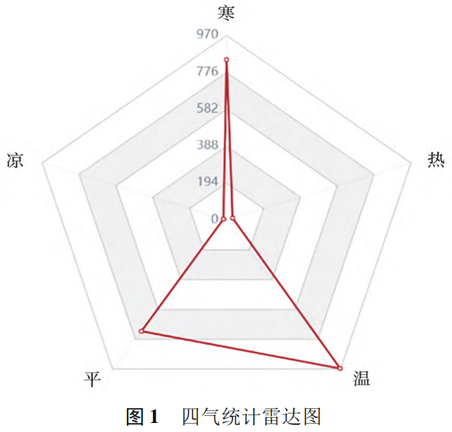 统计纳入药物的相关属性,四气中寒843次、凉16次、平724次、温966次、热32次,以温、寒、平性为主;