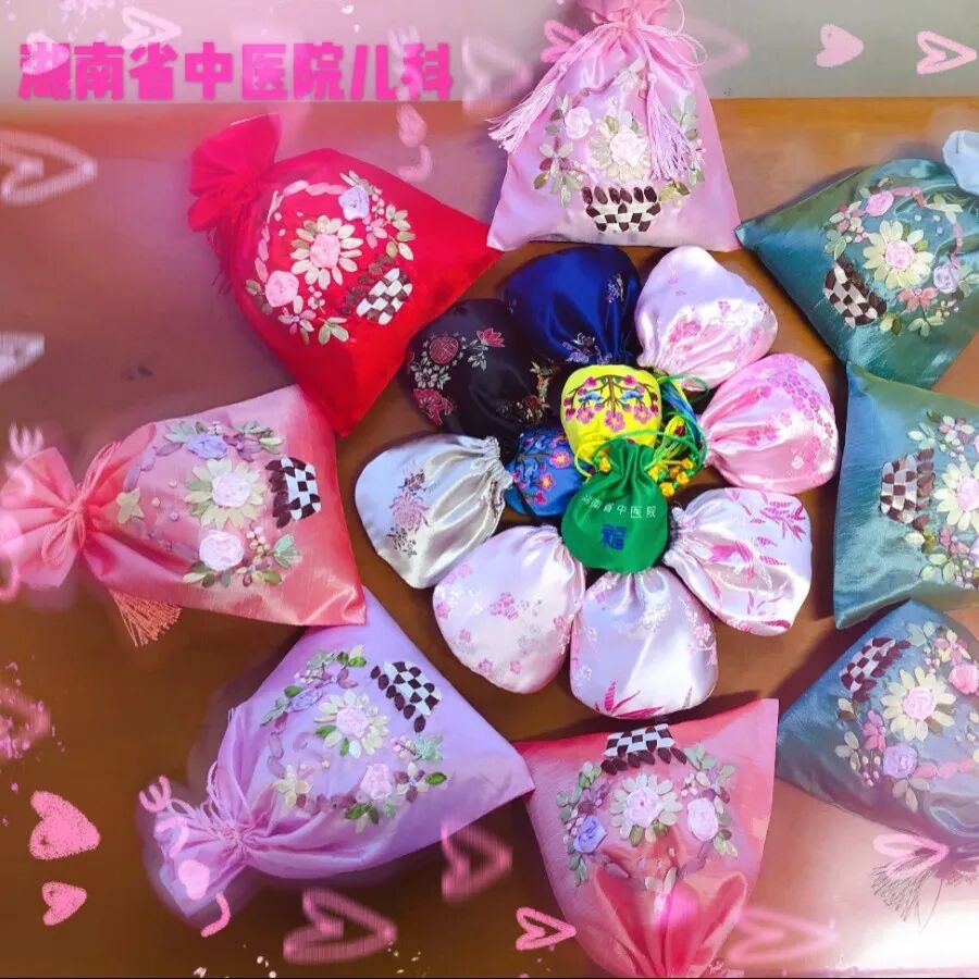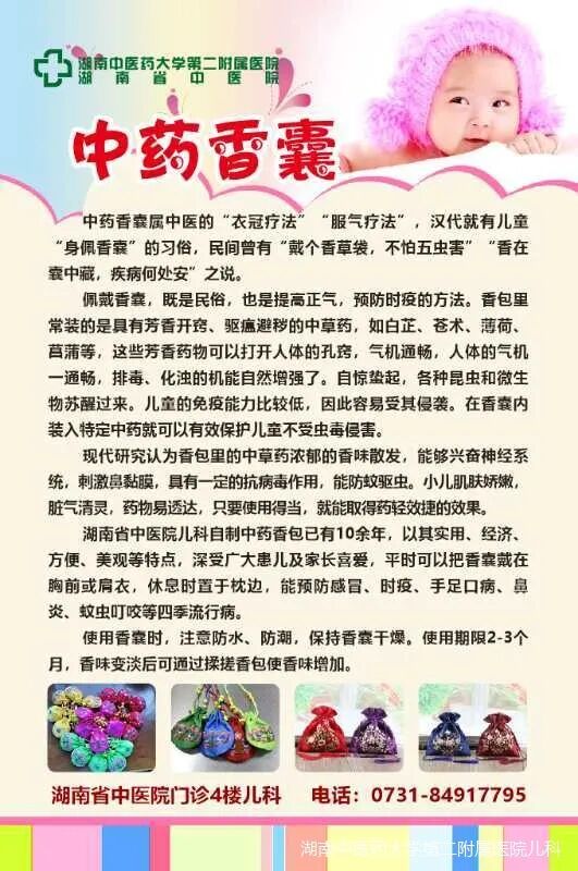 湖南省中医院儿科根据古法,精选十几味中药材精心研制而成的香熏包,纯中药配方、天然无副作用,具有避蚊驱虫、清热解毒、醒脾开胃、安神醒脑的功效。小小中药香囊看似简单,但要发挥防病治病药效,选药、组方、配伍比例非常关键。首先,精选道地药材,保证新鲜;加工、贮存均需保证含有挥发油的有效成分药性未挥发;组方时,因时制宜,选择具有温通开窍、醒脑提神、理气燥湿的中草药合理组方。最后,药粉反复过筛,研磨极细,并严格按比例配制而成。经过严格繁复操作,才能使中药香囊有效成分充分发挥,且气味清香无刺激,不腻不呛,纯正持久,达到防病治病、芳香辟秽的效果。