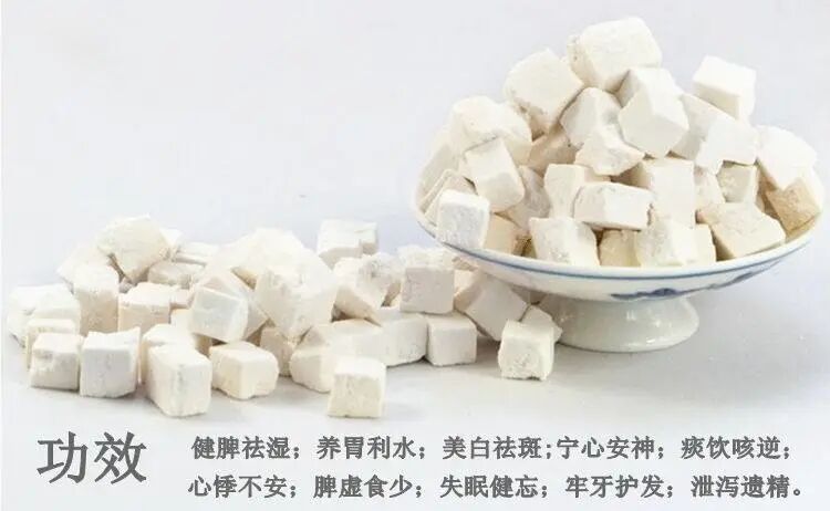茯苓味甘、淡,性平,入脾经,具有很好的健脾利水作用,利水即利湿,茯苓甘补淡渗,性平,作用缓和,无寒热之偏,可以治疗寒热虚实各种水湿。尤其是脾肾阳虚导致的水湿问题。