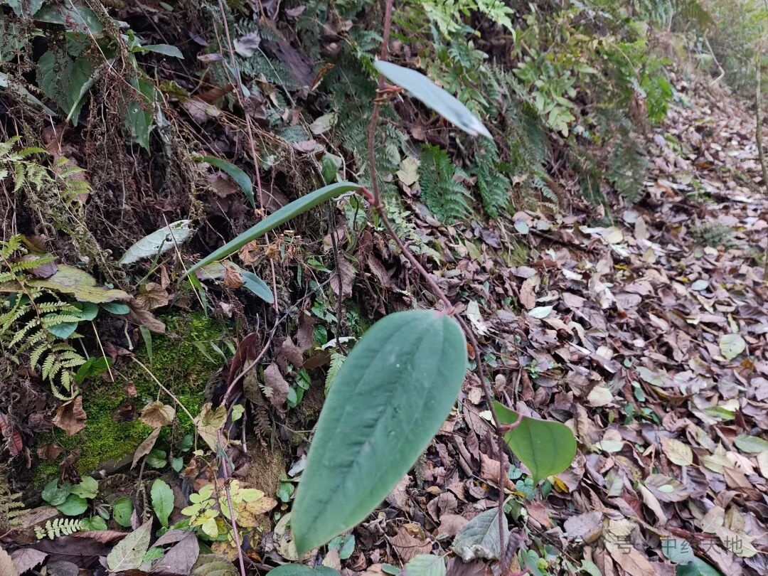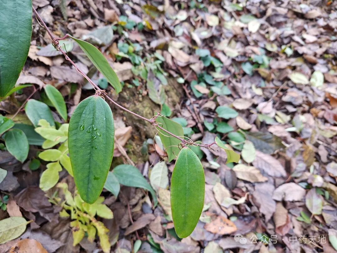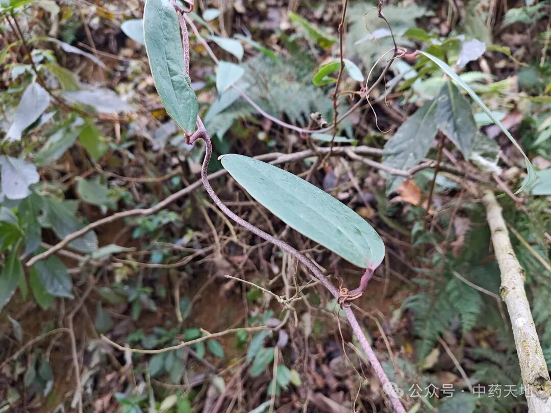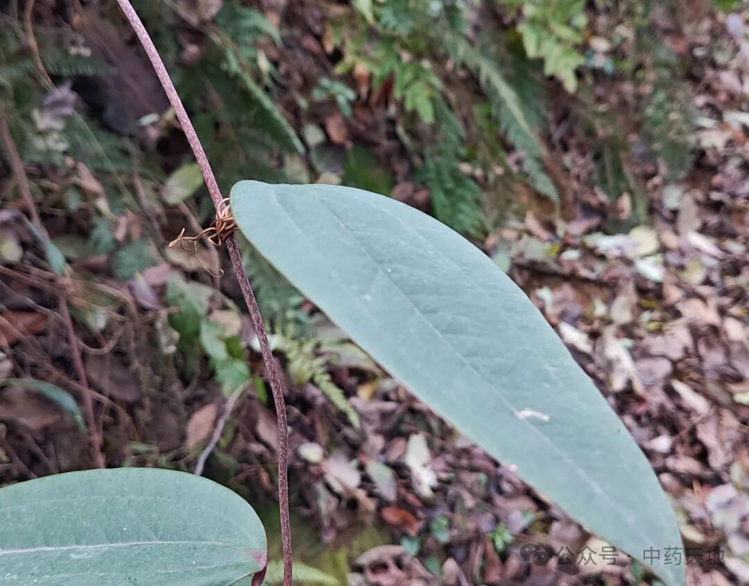 攀援灌木,根状茎块状,常由匍匐茎相连,径2-5厘米;茎长达4米,无剌。叶薄革质,窄椭圆状披针形,长6-15厘米,宽1-7厘米,下面常绿色,有时带苍白色;叶柄长0.5-1.5厘米,窄鞘长为叶柄3/5-1/4,有卷须,脱落点位于近顶端。花绿白色,六棱状球形,径约3毫米;雄花外花被片近扁圆形,宽约2毫米,兜状,背面中央具槽,内花被片近圆形,宽约1毫米,有不规则齿;雄蕊靠合,与内花被片近等长,花丝极短;雌花外形与雄花相似,内花被片全缘,具3枚退化雄蕊。浆果径0.7-1厘米,成熟时紫黑色,具粉霜。