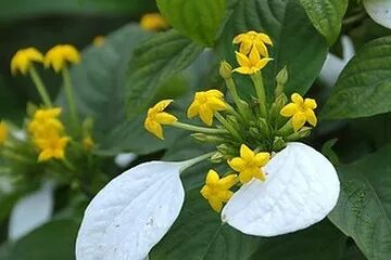 为茜草科玉叶金花属攀援灌木;叶对生或轮生,卵状;萼片叶状雪白色,聚伞花序顶生,花冠黄色,花柱短而内藏。玉叶金花常野生于丘陵山坡、灌丛、林缘、沟谷、山野、路旁等地,其茎叶味甘、性凉,有清凉消暑、清热疏风的功效,是一种具有观赏、药用、生态等多种价值的树种。