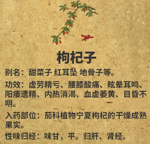 枸杞子则入肝肾二经,同样药性平和,能够滋补肝肾,益精明目,对于肝肾不足引起的视力减退、眼花等有显著改善作用,同时也能补充肾精,解决肾精不足的问题,让肾精充沛,滋养全身。