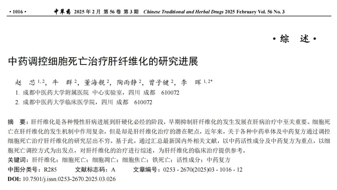 来 源:赵 芯,牛 群,董海舰,陶雨静,曾子键,李 晖.中药调控细胞死亡治疗肝纤维化的研究进展[J]. 中草药, 2024, 56(2): 1016-1027.