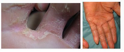 手足癣:手足癣是手癣和足癣的总称。手癣(tinea manuum)是指发生在手掌和指间的皮肤癣菌感染。足癣(tinea pedis)是指发生于足跖部及趾间的皮肤癣菌感染。足癣是皮肤癣菌病中最常见的疾病,多见于成人,全世界流行。在足癣发病中,缺乏皮脂腺和穿着封闭性鞋子造成的湿润环境是最重要的因素。主要的致病菌包括红色毛癣菌、须癣毛癣菌、絮状表皮癣菌、断发毛癣菌。足癣极少引起严重的疾病或死亡,但可以作为细菌入侵的门户而引起细菌性蜂窝织炎,趾间型足癣具有最高危险性,其次甲癣,再次是足跖部足癣。