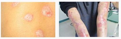银屑病(牛皮癣):银屑病属称牛皮癣银屑病是一种常见的慢性炎症性皮肤病。它属于多基因遗传的疾病,可由多种激发因素,如创伤、感染、药物等都可能在易感个体中诱发该病。典型的皮肤表现是境界清楚的具有银白色鳞屑的红色斑块。轻者可表现为几个银币大小的肘膝部位斑块,重者也可以全身皮肤受累。其病生理机制主要为表皮增生分化的异常和免疫系统的激活。