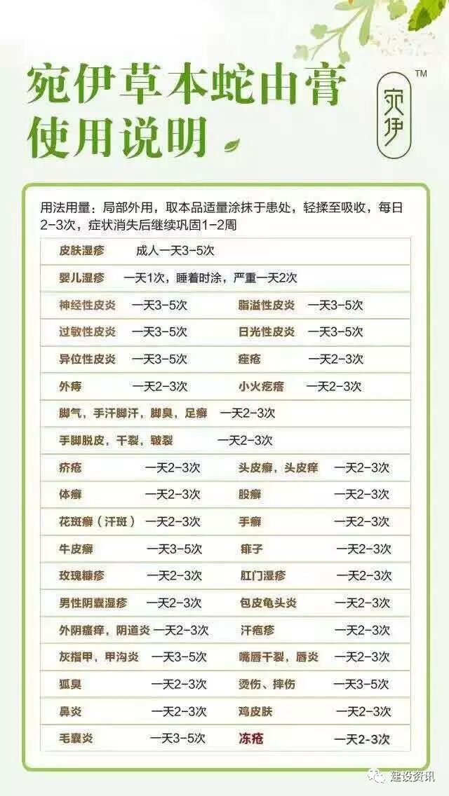 用法用量:局部外用,取本品适量涂抹于患处,轻揉至吸收,每日2-3次,症状消失后继续巩固1-2周皮肤湿疹 成人一天3-5次,婴儿湿疹一天1次,睡着时涂,严重一天2次神经性皮炎 一天3-5次脂溢性皮炎 一天3-5次过敏性皮炎 一天3-5次日光性皮炎 一天3-5次异位性皮炎 一天3-5次痤疮 一天2-3次外痔 一天2-3次小火疙瘩 一天2-3次脚气,手汗脚汗,脚臭,足癣 一天2-3次手脚脱皮,干裂,皲裂 一天2-3次疥疮 一天2-3次头皮癣,头皮痒 一天2-3次体癣 一天2-3次股癣 一天2-3次花斑癣(汗斑)一天2-3次手癣 一天2-3次牛皮癣 一天3-5次痱子 一天2-3次玫瑰糠疹 一天2-3次肛门湿疹 一天2-3次男性阴囊湿疹 一天2-3次包皮龟头炎 一天2-3次外阴瘙痒,阴道炎 一天2-3次汗疱疹 一天2-3次灰指甲,甲沟炎 一天3-5次嘴唇干裂,唇炎 一天2-3次狐臭 一天2-3次烫伤、摔伤 一天3-5次鼻炎 一天2-3次鸡皮肤 一天2-3次毛囊炎 一天3-5次