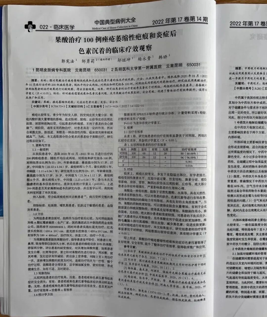 我院门诊部主任邬继坤、业务院长郭宪法、痤疮治疗名医工作站首席专家邹勇莉、皮肤外科主任杨永贵、激光物理治疗中心主任韩娇共同研究发表的《果酸治疗100例痤疮萎缩性疤痕和炎症后色素沉着的临床疗效观察》文献在《中国典型病例大全》2022年第17卷第14期刊登。