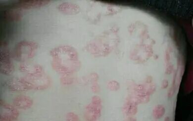 真菌性皮肤病体癣:好发于躯干、四肢等部位,表现为边界清楚的环状或半环状红斑,边缘有丘疹、水疱,中央趋于消退,有瘙痒感。