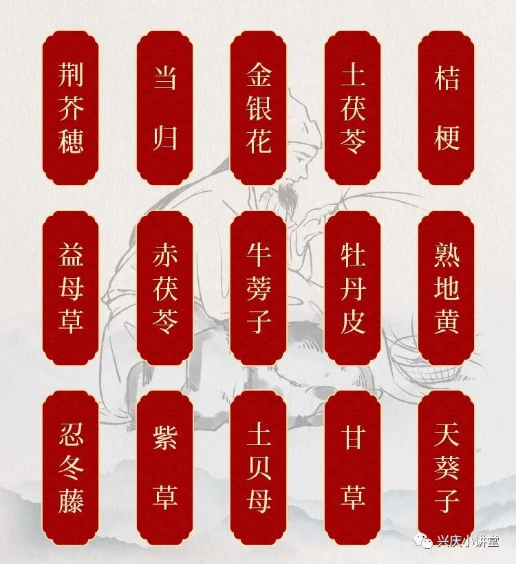 茜草、桃仁、荆芥穗(炭)、蛇蜕(酒炙)、赤芍、当归、白茅根、地肤子、苍耳子(炒)、地黄、连翘、金银花、苦地丁、土茯苓、黄柏、皂角刺、桔梗、益母草、苦杏仁(去皮炒)、防风、赤茯苓、白芍、蝉蜕、牛蒡子(炒)、牡丹皮、白鲜皮、熟地黄、大黄(酒炒)、忍冬藤、紫草、土贝母、川芎(酒炙)、甘草、白芷、天葵子,紫荆皮、鸡血藤、浮萍、红花。