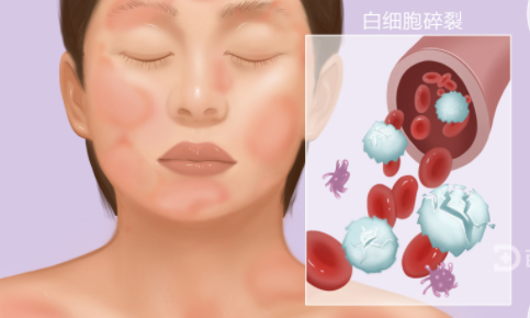 荨麻疹性血管炎,皮肤主要特征为风团样皮损,与荨麻疹类似,但风团皮损持续时间长,往往24~72小时,甚至数天不消失。皮损触之有浸润,有时皮损处可见紫癜。少数病例有水疱,但无坏死。损害消退后遗留色素沉着或脱屑。自觉有痒感或烧灼感。有人会有发热,关节疼,腹疼,补体降低等情况。