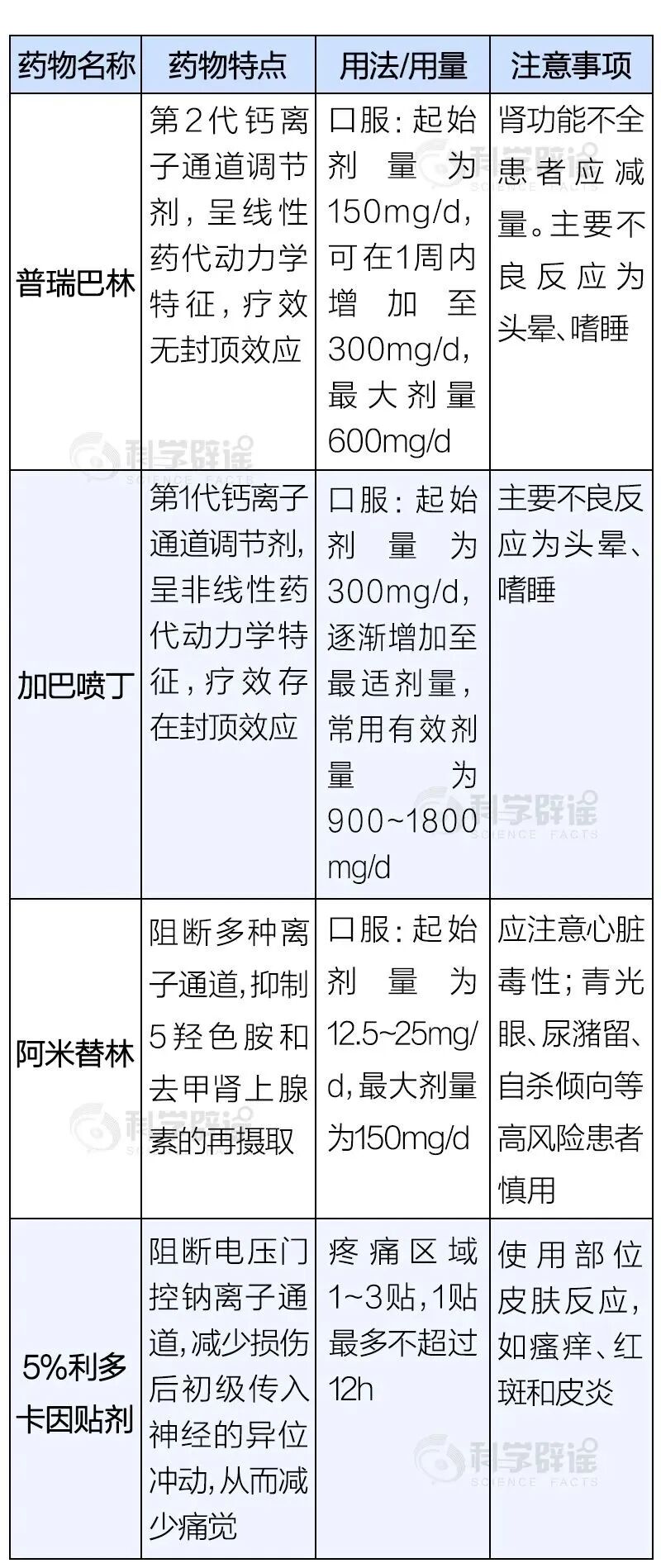 疼痛常贯穿带状疱疹疾病的全过程,建议对不同程度的疼痛选用不同的镇痛药物。轻中度疼痛可选用对乙酰氨基酚、非甾体类抗炎药或曲马多;中重度疼痛可使用治疗神经病理性疼痛的药物,如钙离子通道调节剂加巴喷丁、普瑞巴林,三环类抗抑郁药如阿米替林,具体用法见下表,或选择阿片类药物,如吗啡或羟考酮等。