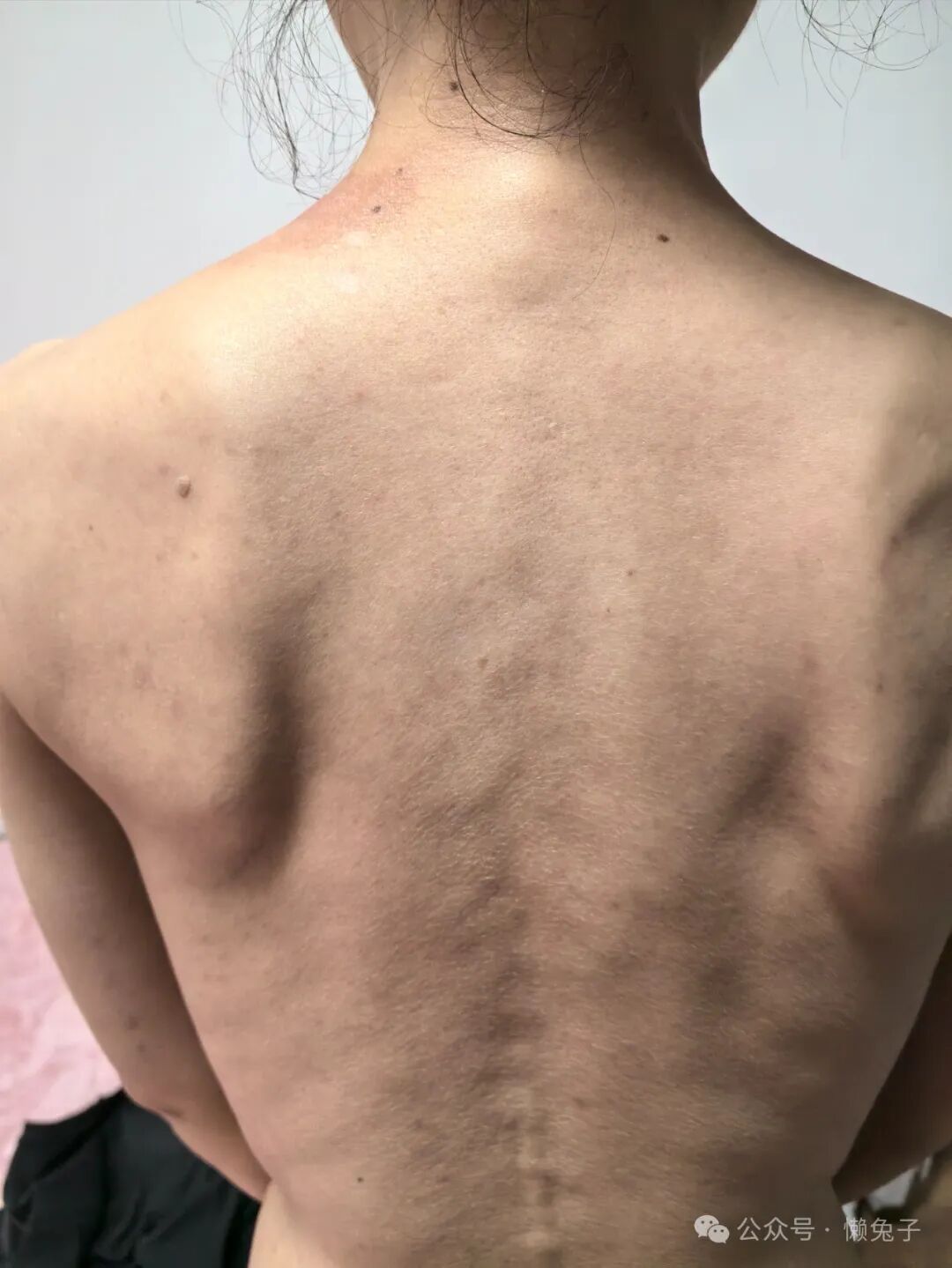 背部、臀部和肚子上也全部都是类似的红色团块,被挠的血迹斑斑,鉴于涉及隐私就不上图了。
